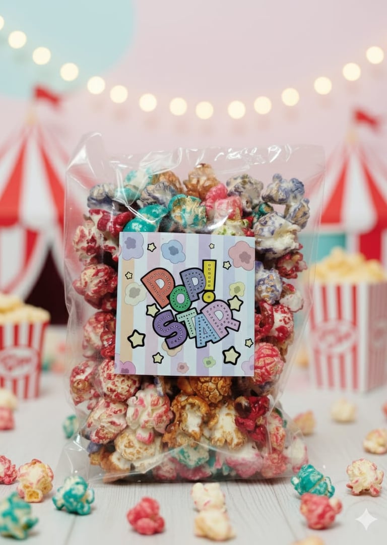 HAZLAS TUYAS. Ya sea como marca blanca o como un maravilloso producto promocional, consiente a tus clientes con Pop! Star. Nosotros nos encargamos de ponerle el logo de tu marca a nuestras bolsas de palomitas.